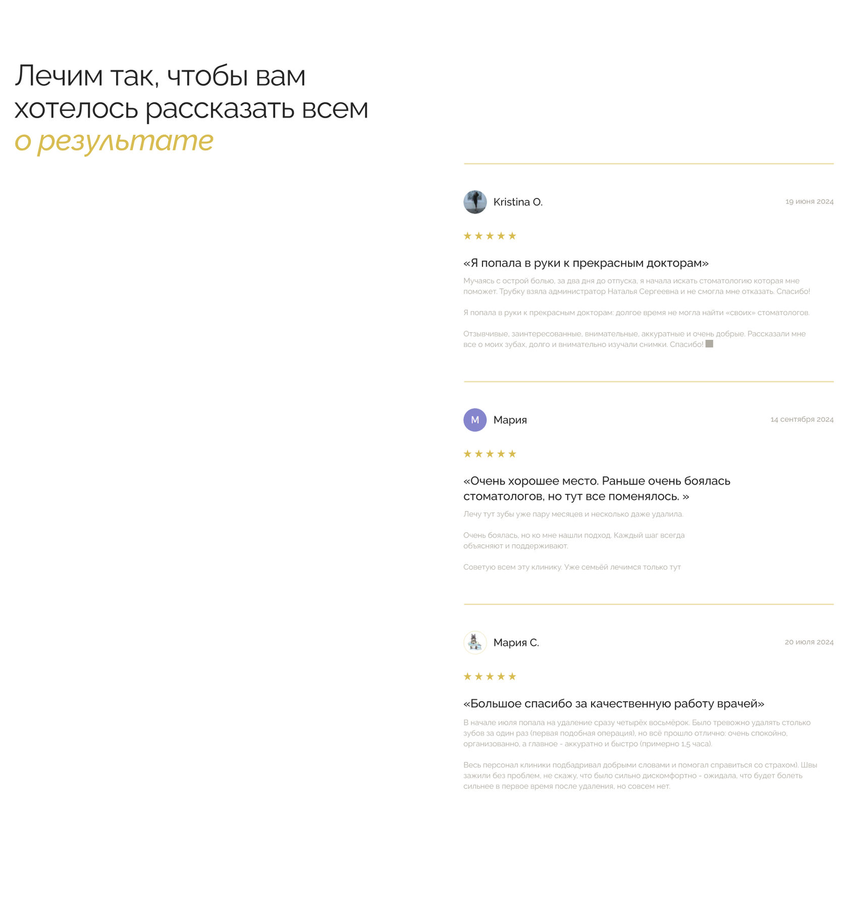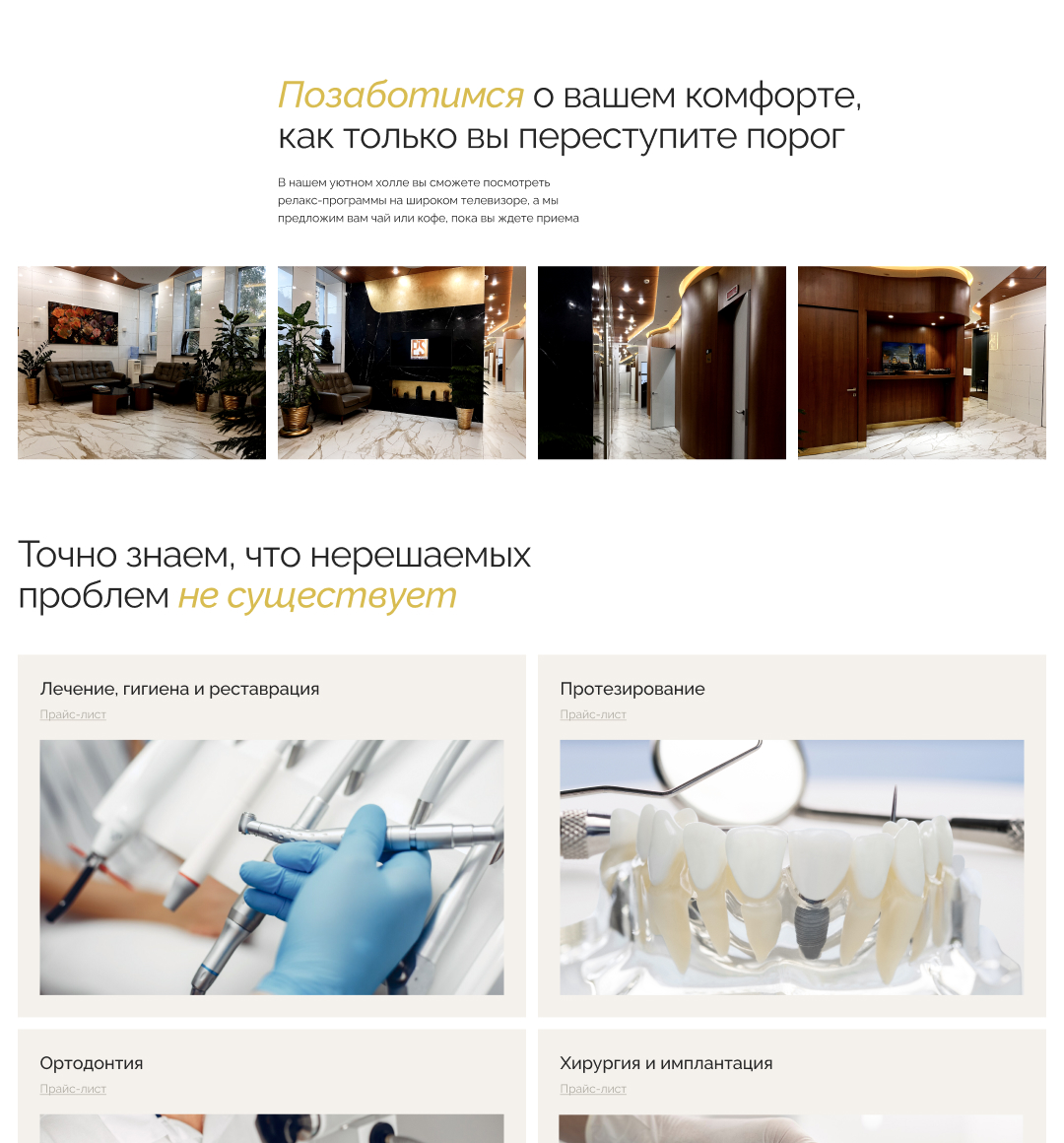 Стоматологическая клиника премиум сегмента. Клиент обязательно хотел, чтобы дизайн был в черных, белых и золотистых цветах. Было предложено несколько вариантов концепции дизайна и клиент остановился на данном варианте.